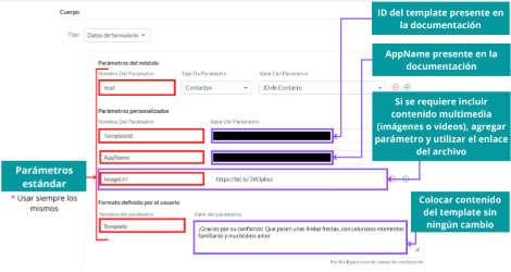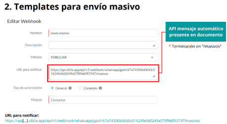 • Accede a configuración de templates → Selecciona “Template para Envío Masivo” → Define el contenido y el público objetivo → Programa el envío.