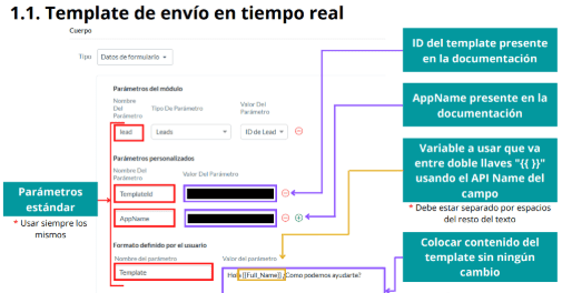 • Accede a configuración de templates → Selecciona “Nuevo Template Básico” → Define el mensaje y el tiempo de envío (en tiempo real o con delay)→ Guarda.